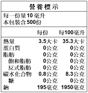 水、釀造食醋、砂糖、食鹽、洋蔥、柳橙濃縮汁、胡蘿蔔汁、番茄糊、辣椒、大茴、小茴、芹菜籽、黑胡椒、陳皮、丁香、焦糖色素、香料